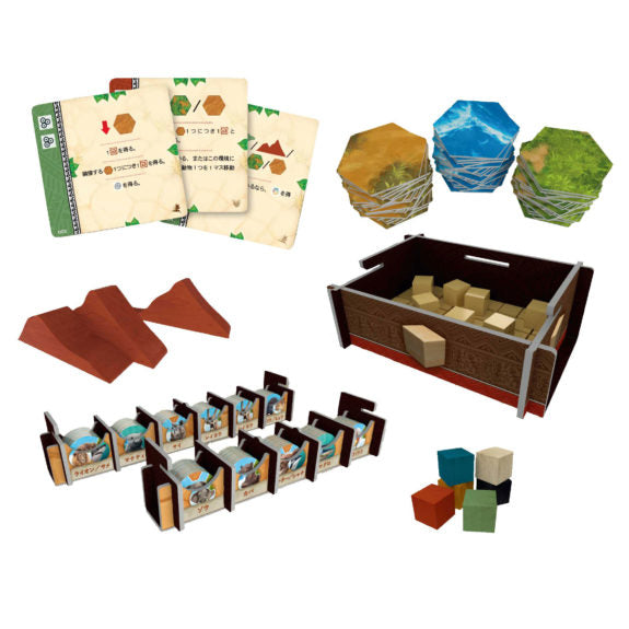 ・それぞれが異なる105枚のカード、重量感のあるエレメント、創造する大地を構成する75枚の地形タイル、組み立て式のトークンケースとキューブ箱、102個の動物トークン……と内容物が非常に豊富で豪華。